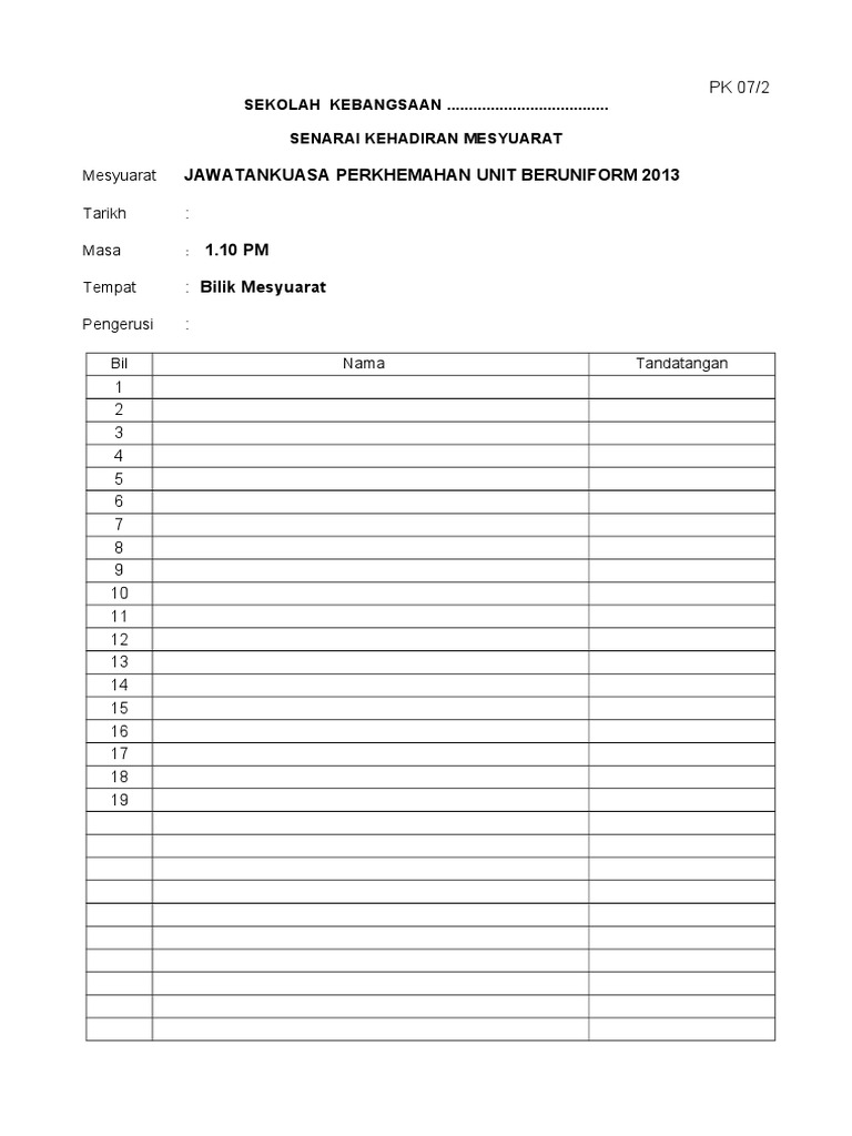 Borang Pk 07 2 Senarai Kehadiran Mesyuarat Doc Google Drive