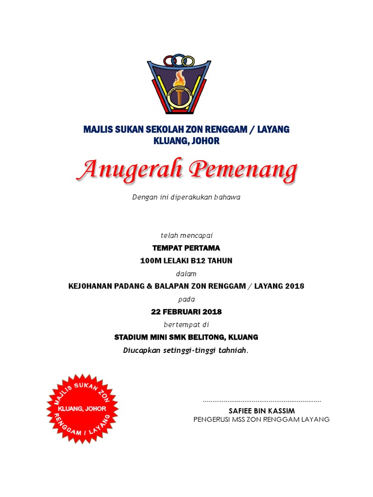 Contoh sijil pemenang pertandingan. Wang tunai rm500 dan sijil 4. Tampi tampi darat semporna tahun 2013 pada 08 februari 2013 marasun bin hassim pegawai belia dan sukan sabah daerah semporna. Semua bahan adalah contoh sahaja pelawat dinasihatkan membuat rujukan tambahan untuk maklumat yang lebih terperinci.