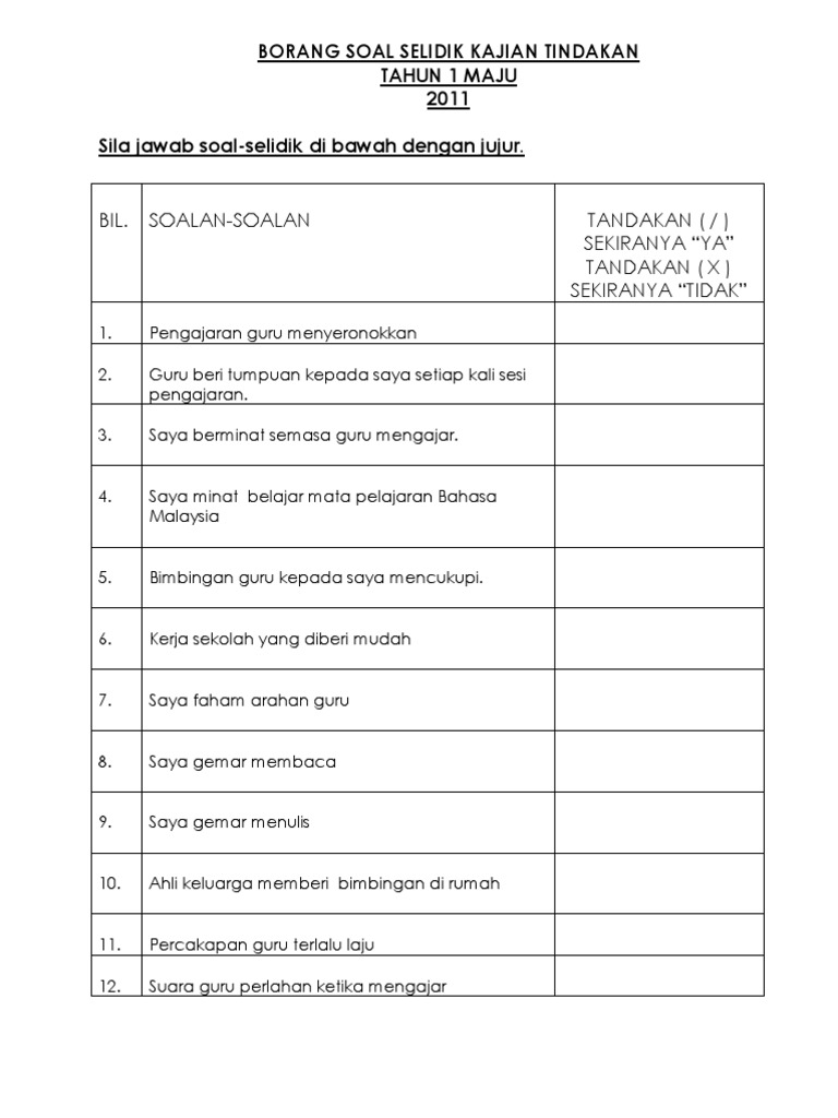 Borang Soal Selidik Kajian Tindakan Docx Document