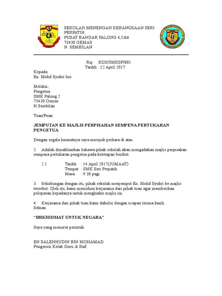 Contoh Surat Rasmi Jemputan Ke Program Surasmi G