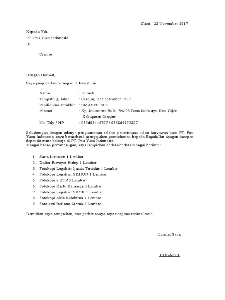 Contoh Surat Lamaran Kerja Di Pabrik Plastik