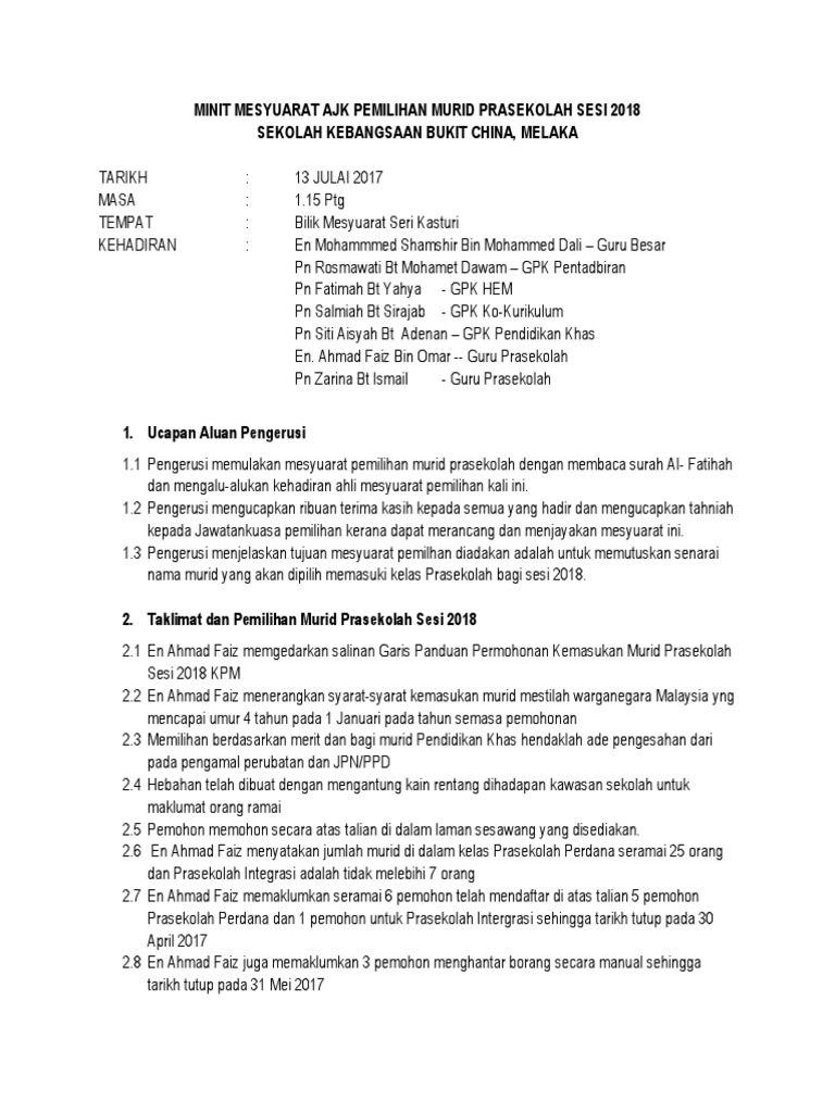 Minit Mesyuarat Ajk Pemilihan Kemasukan Murid Prasekolah Sesi 2016 Docx