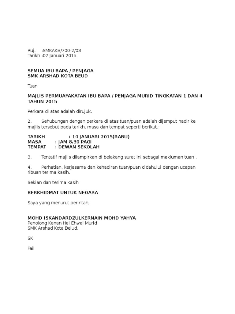 Surat Jemputan Ibu Bapa Mesyuarat Pibg 2015