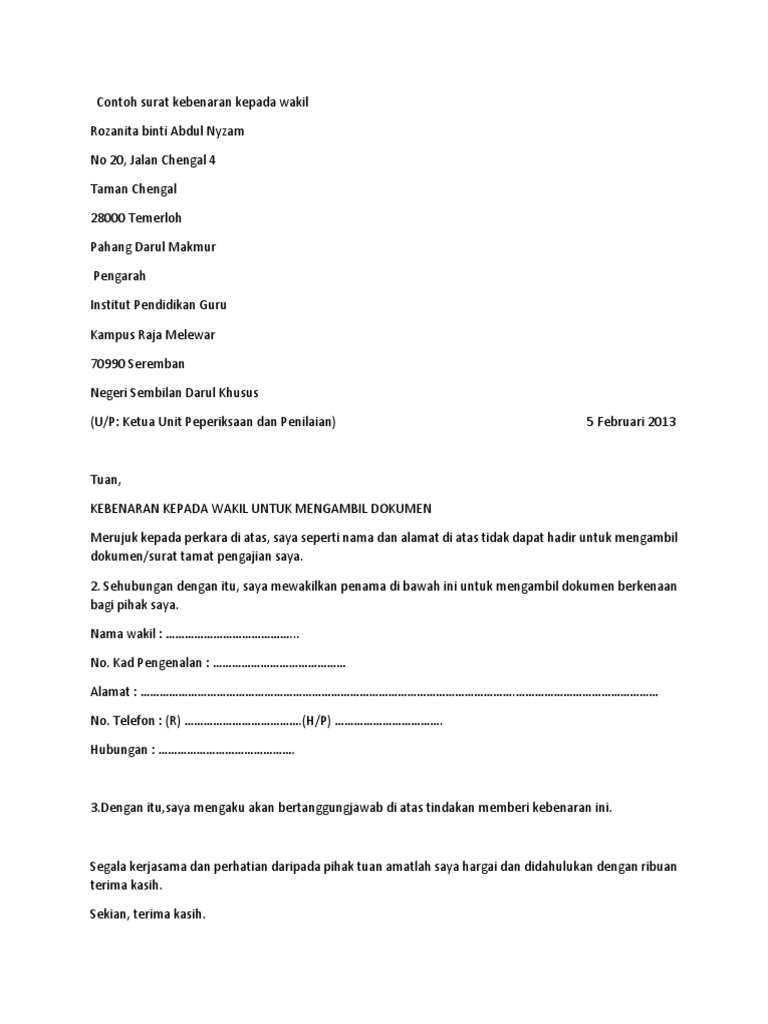 Contoh Surat Kebenaran Kepada Wakil