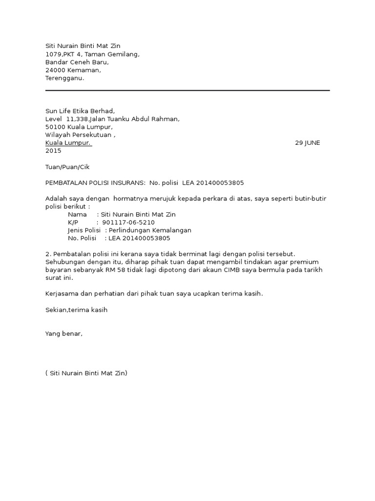 Contoh Surat Pembatalan Insurans Sun Life