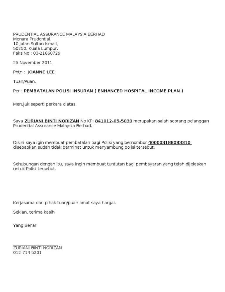 Contoh Surat Batal Takaful Bsn Prudential Malaysia