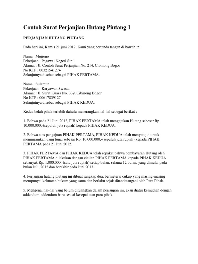 Contoh Surat Perjanjian Hutang Piutang Gawe Cv Cute766
