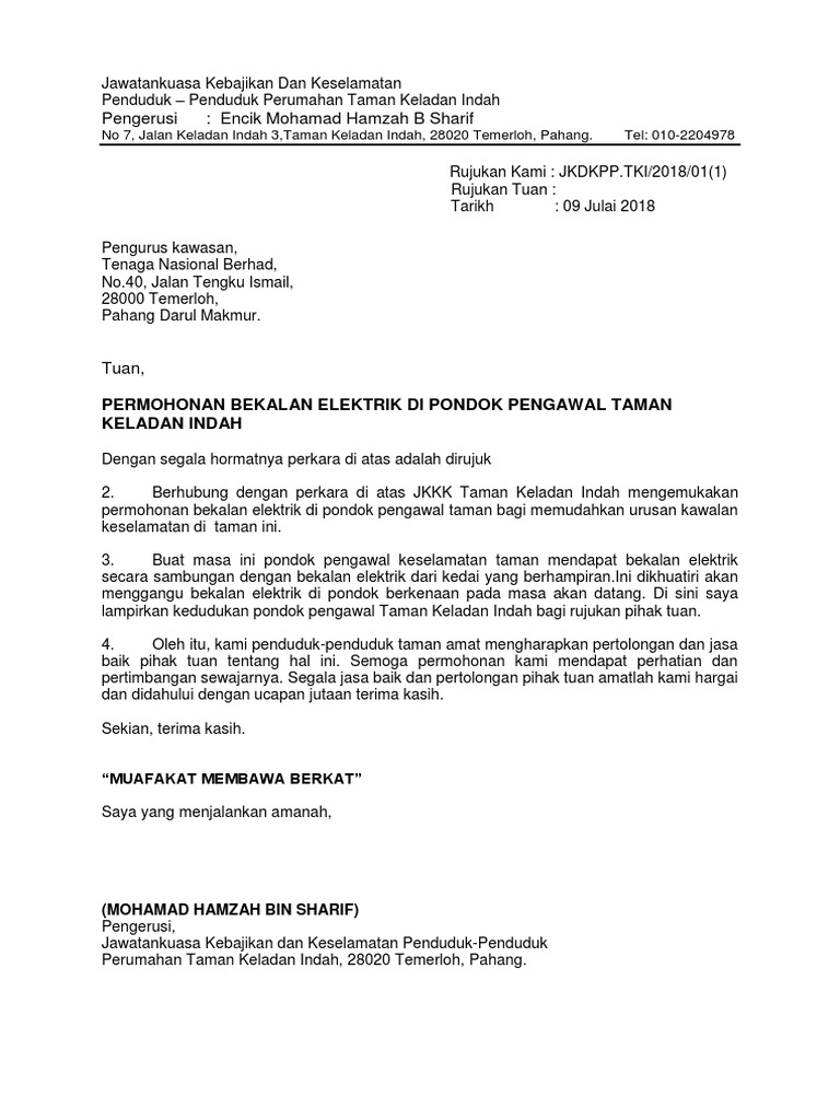 Contoh Surat Rasmi Permohonan Bekalan Elektrik Tnb Arasmi