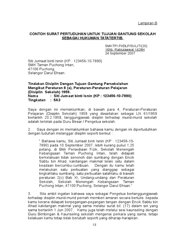 4 Contoh Surat Pertuduhan Gantung Sekolah Lampiran B
