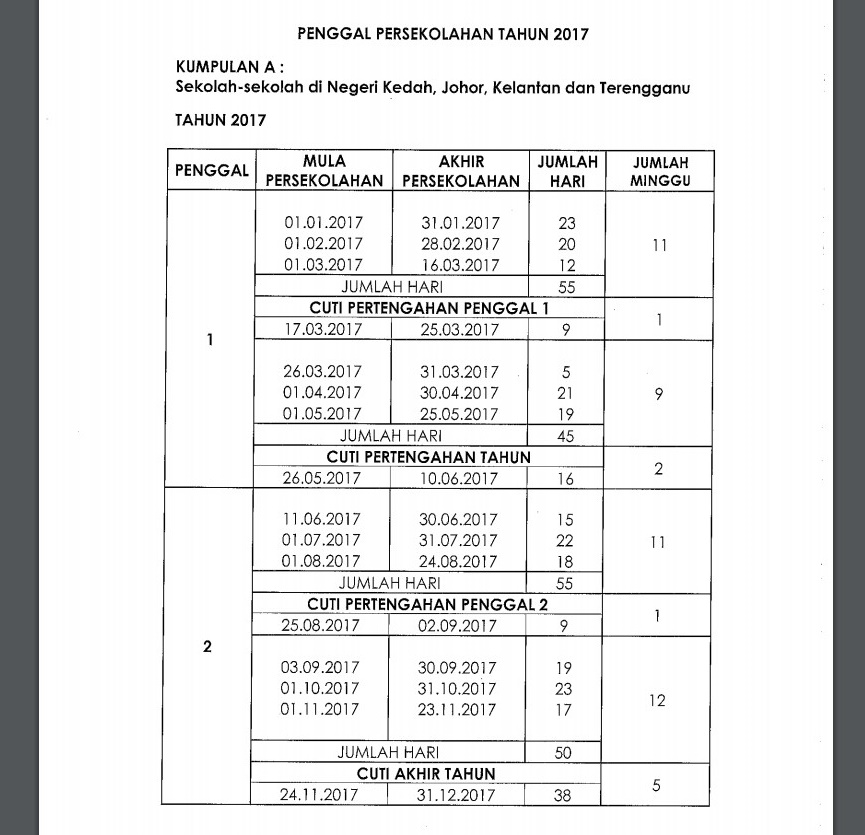 Takwim Penggal Dan Cuti Persekolahan Tahun 2017