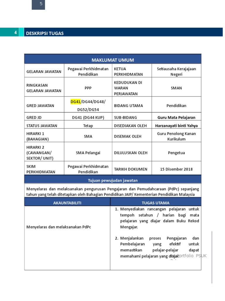 Deskripsi Tugas Pegawai Perkhidmatan Pendidikan Siswazah Gred Dg41