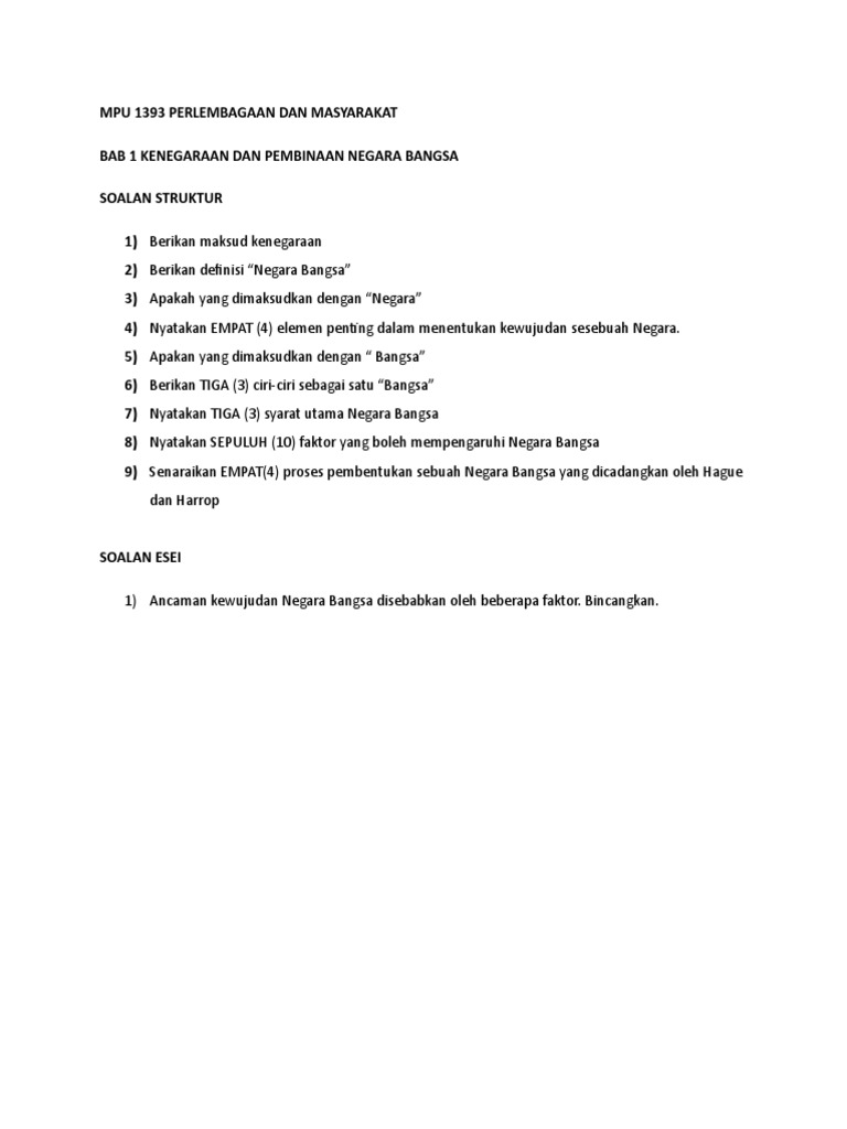 Soalan Latihan Bab 1 Kenegaraan Dan Pembinaan Negara Bangsa
